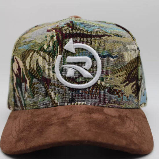 The Herencia Cap features a vintage tapestry-style crown paired with a soft suede brown brim, finished with our signature embroidered Reborn monogram logo.